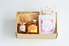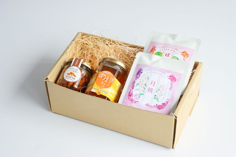 奄美の大自然の恵みを受けて作られた島はちみつ、きび酢を使ったコリコリ食感の大豆ピクルス、ノンカフェインのハーブティー2つを詰めたセットです。
