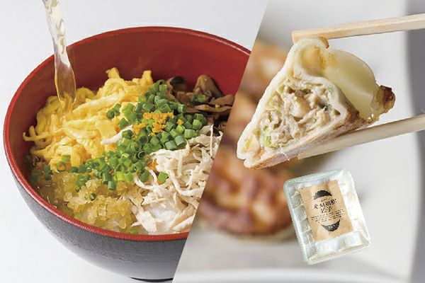 安全でおいしいこだわりのシマジュウリ(島料理)を届けている「キッチンパルム」を運営するぐすく農産がつくる奄美大島の郷土料理鶏飯(けいはん)と奄美島豚餃子のセット。
