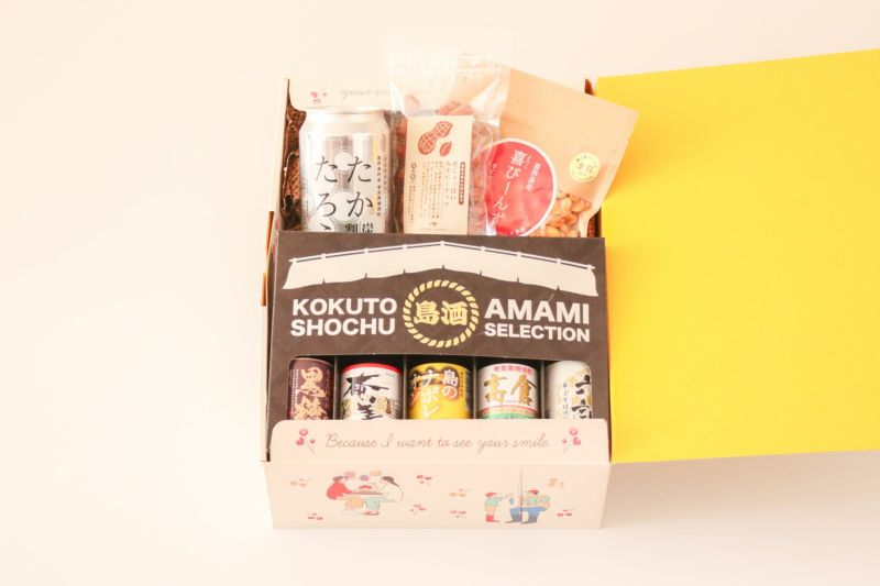 奄美群島の特産品「黒糖焼酎」のいろんな銘柄を楽しめる飲み比べセットに、おつまみをセットにしたギフトセットです。