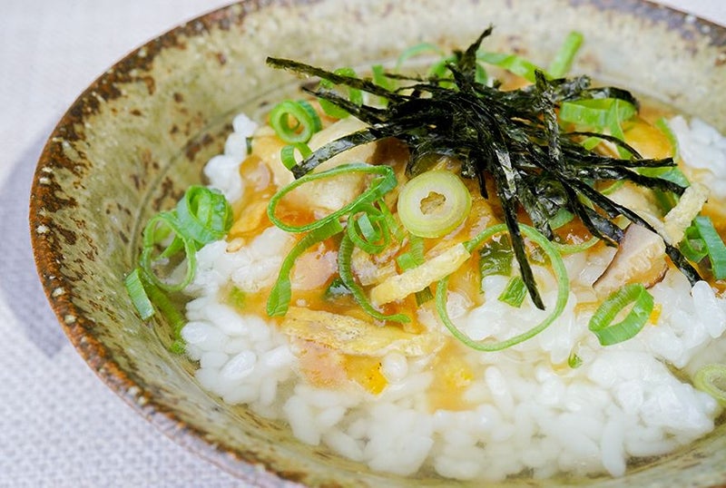 鶏肉や錦糸卵、パパイヤの漬物、シイタケ、ネギ、ゆず(またはタンカン)の皮、海苔などを温かいご飯の上に盛りつけ、じっくり煮込まれた特製の鶏ガラスープをかけて召し上がっていただきます。