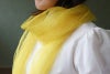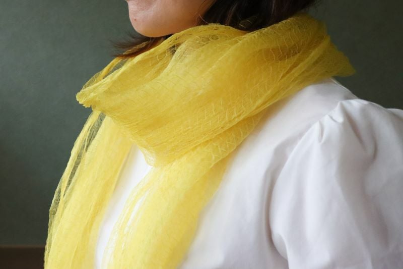 こちらは、フクギ(福木)を使って染めたイエローのストール。奄美では集落や屋敷周りに植えられているフクギの葉を煮詰めて染料にしています。
