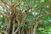 与論島に自生する樹「ガジュマル」。枝から根を垂らし、気根をつくっていく様は「溶樹」とも呼ばれ、精霊(ケンムン)が棲むという伝説もある聖樹です。奄美では多くのガジュマルが自生しており、「神の宿る木」、「多幸の木」として昔から島民たちに親しまれています。
